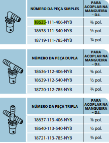 Espigas de mangueira tamanhos 3/8", 1/2" ou 3/4" de diâmetro interno;